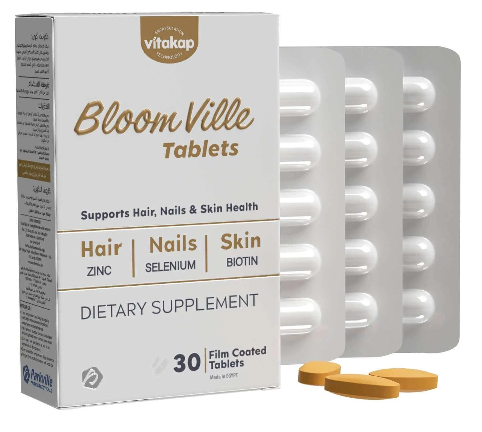 Bloomville is a dietary supplement for hair, nail, and skin support. Its Balanced formula with 27 ingredients, including Vitamins, minerals, and specific elements supplies the Skin, Hair and Nails with the needed nutrients for healthy growth With a unique microencapsulation technique that increases the absorption, effectiveness, and protection of its ingredients. 30 Film-Coated Tablets.
